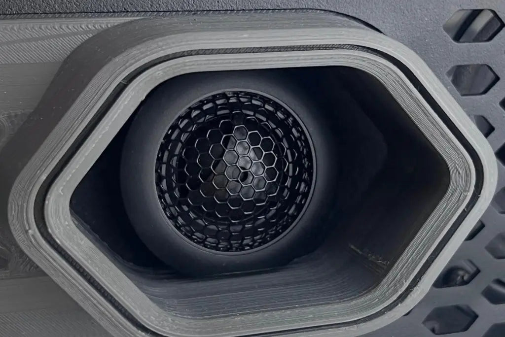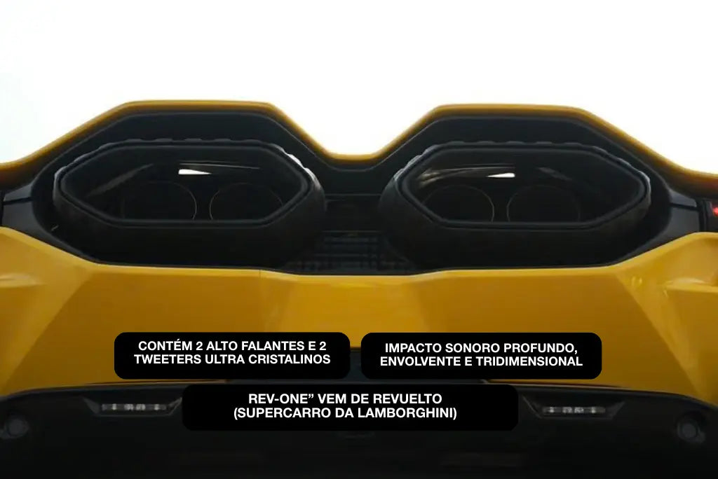 O Rev-One possui um sistema de 3 vias com 350 watts RMS, composto por um subwoofer poderoso, dois alto-falantes equilibrados e dois tweeters cristalinos, entregando um som profundo e envolvente.